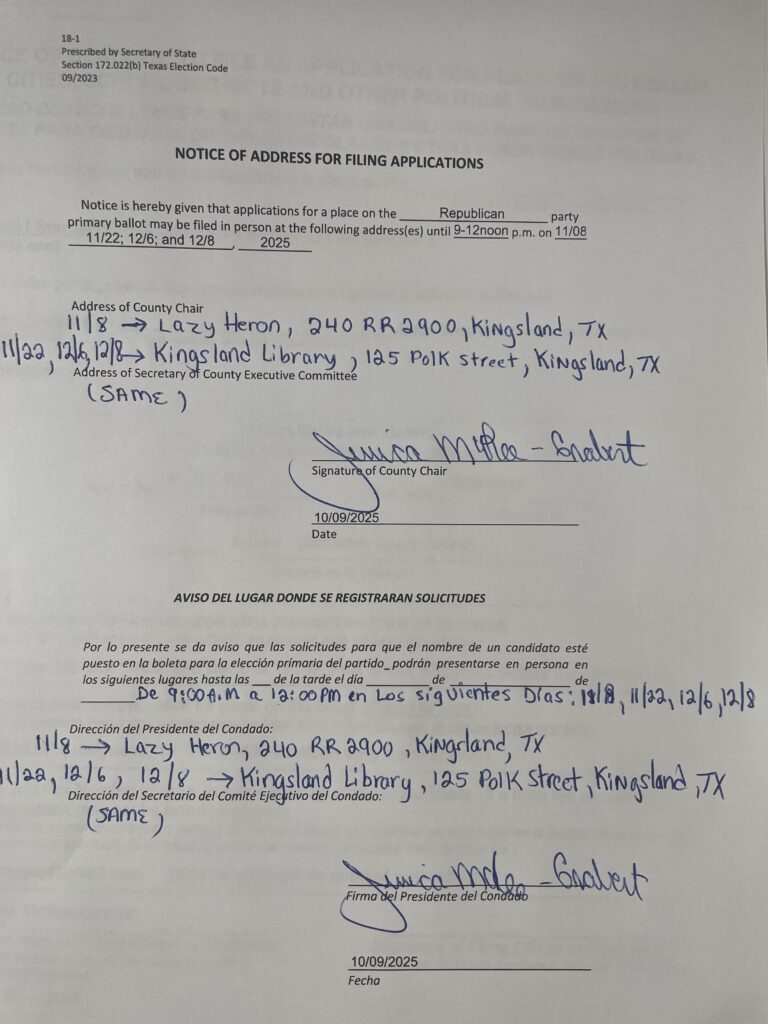 For any other dates and times between the filing period of 11/08/25 – 12/08/2025 that are not included below, please make a reservation by contacting the Jessica McRee-Grabert, County chair at 512-710-4819. You may also reach out to Yuki Graves, Secretary, Llano County GOP by calling 703-628-4742. Filing ends December 8th. Applications must be received by 6pm.