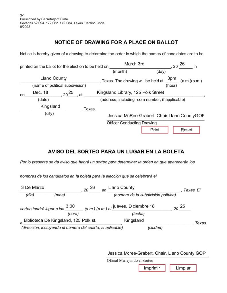 NOTICE OF DRAWING FOR A PLACE ON THE BALLOT